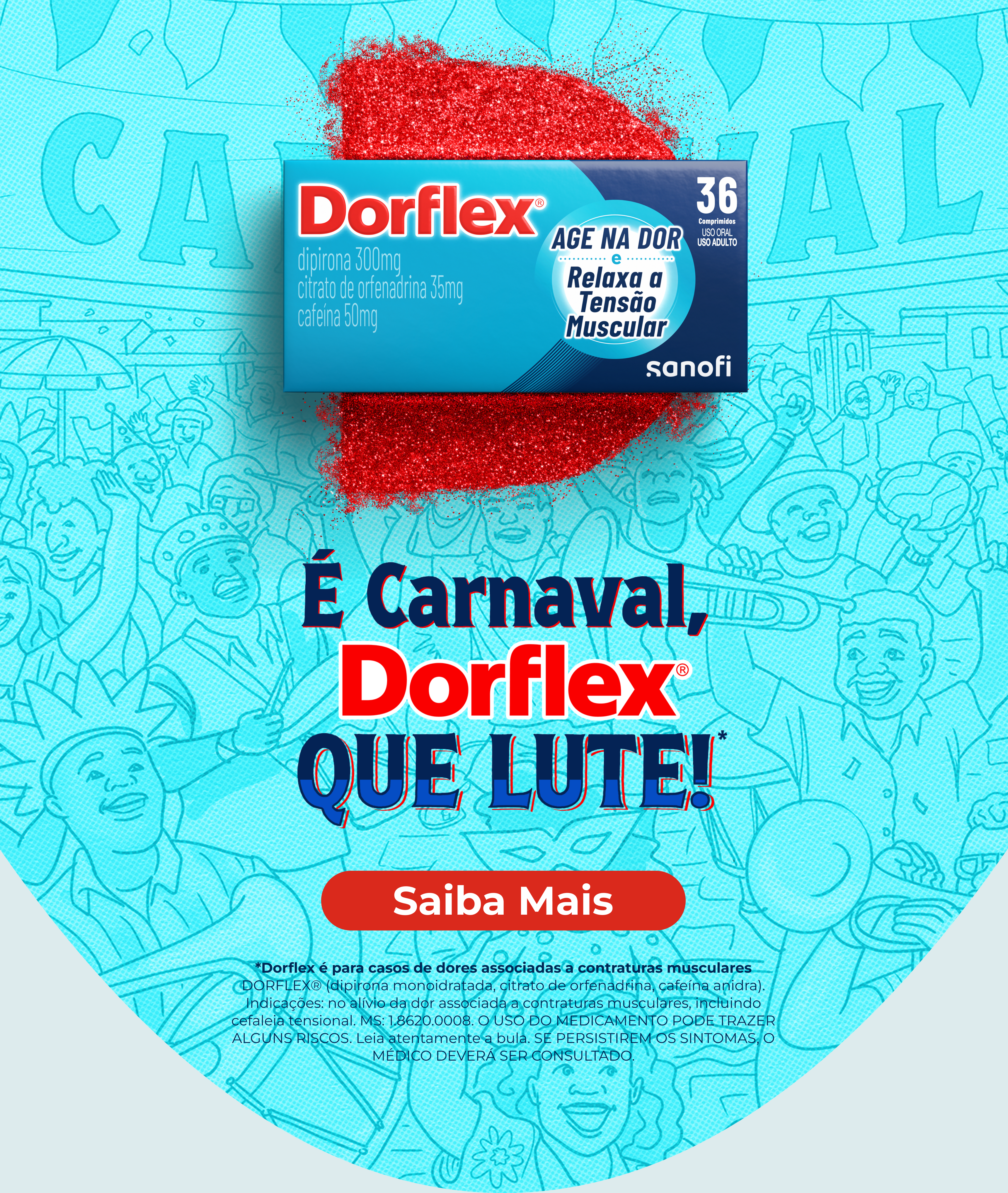 DORFLEX® MAX (dipirona monoidratada, citrato de orfenadrina, cafeína anidra). Indicações: no alívio da dor associada a contraturas musculares, incluindo cefaleia tensional. MS: 1.8620.0008. O USO DO MEDICAMENTO PODE TRAZER ALGUNS RISCOS. Leia atentamente a bula. SE PERSISTIREM OS SINTOMAS, O MÉDICO DEVERÁ SER CONSULTADO.