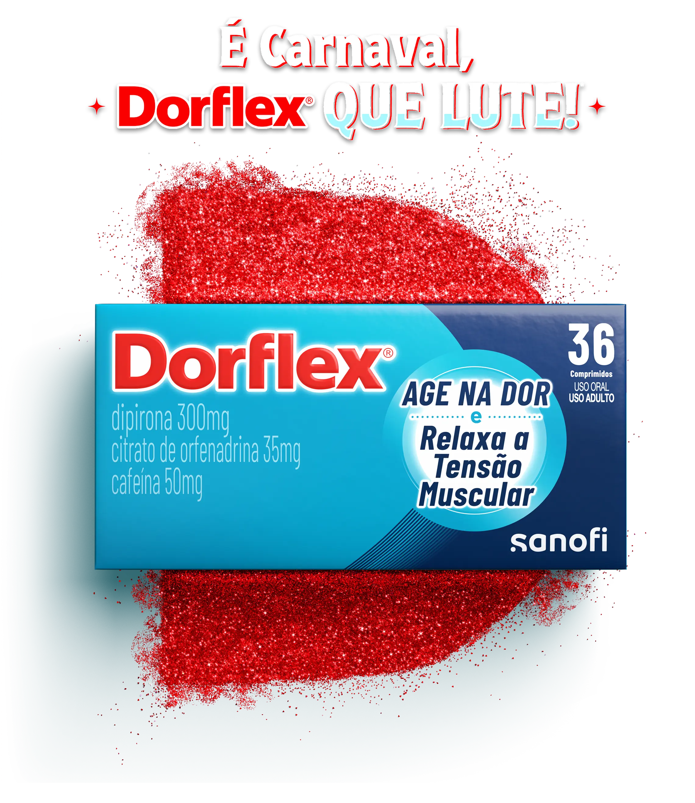 DORFLEX® (dipirona monoidratada, citrato de orfenadrina, cafeína anidra). Indicações: no alívio da dor associada a contraturas musculares, incluindo cefaleia tensional. MS 1.8620.0008. O USO DO MEDICAMENTO PODE TRAZER ALGUNS RISCOS. Leia atentamente a bula. SE PERSISTIREM OS SINTOMAS, O MÉDICO DEVERÁ SER CONSULTADO.