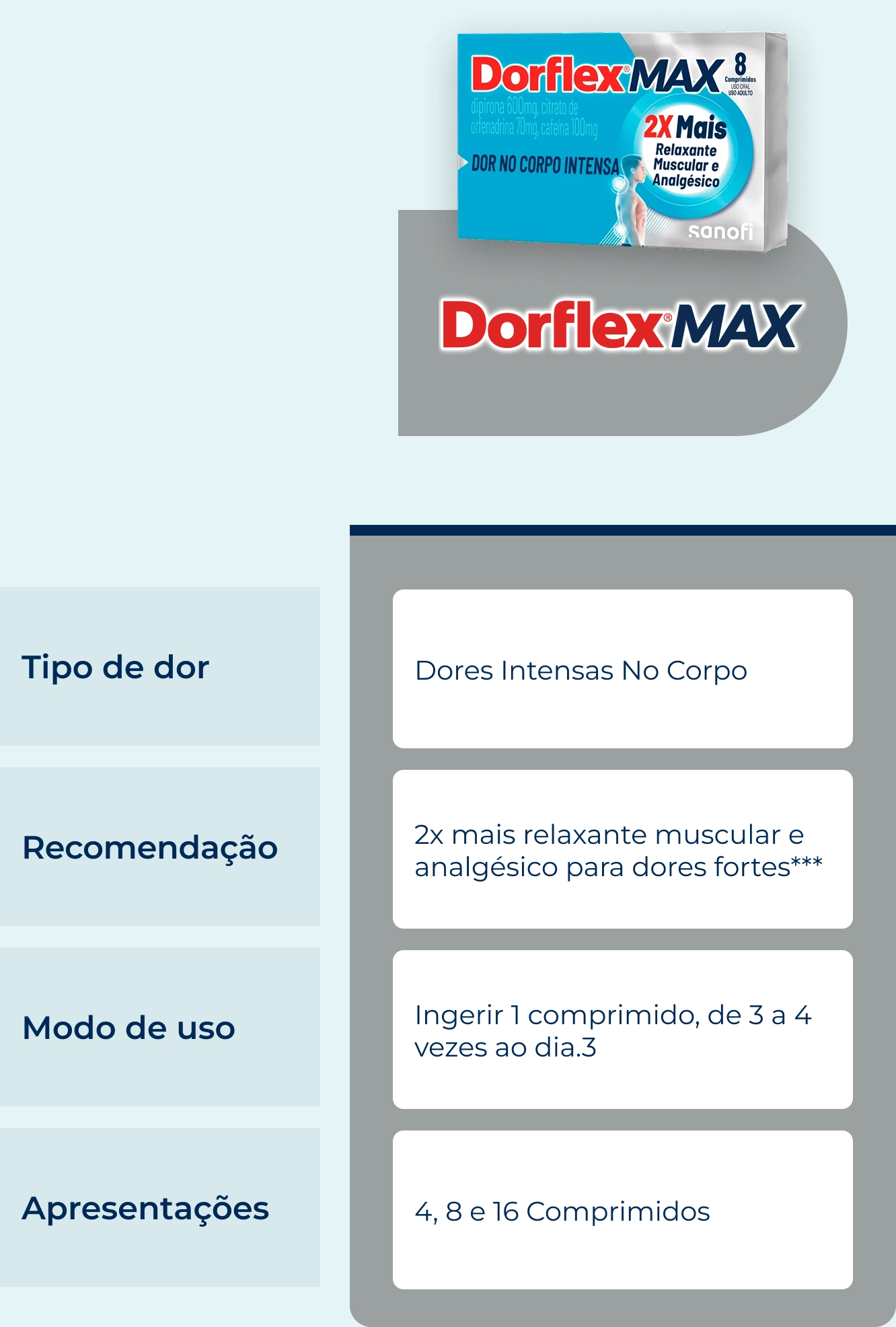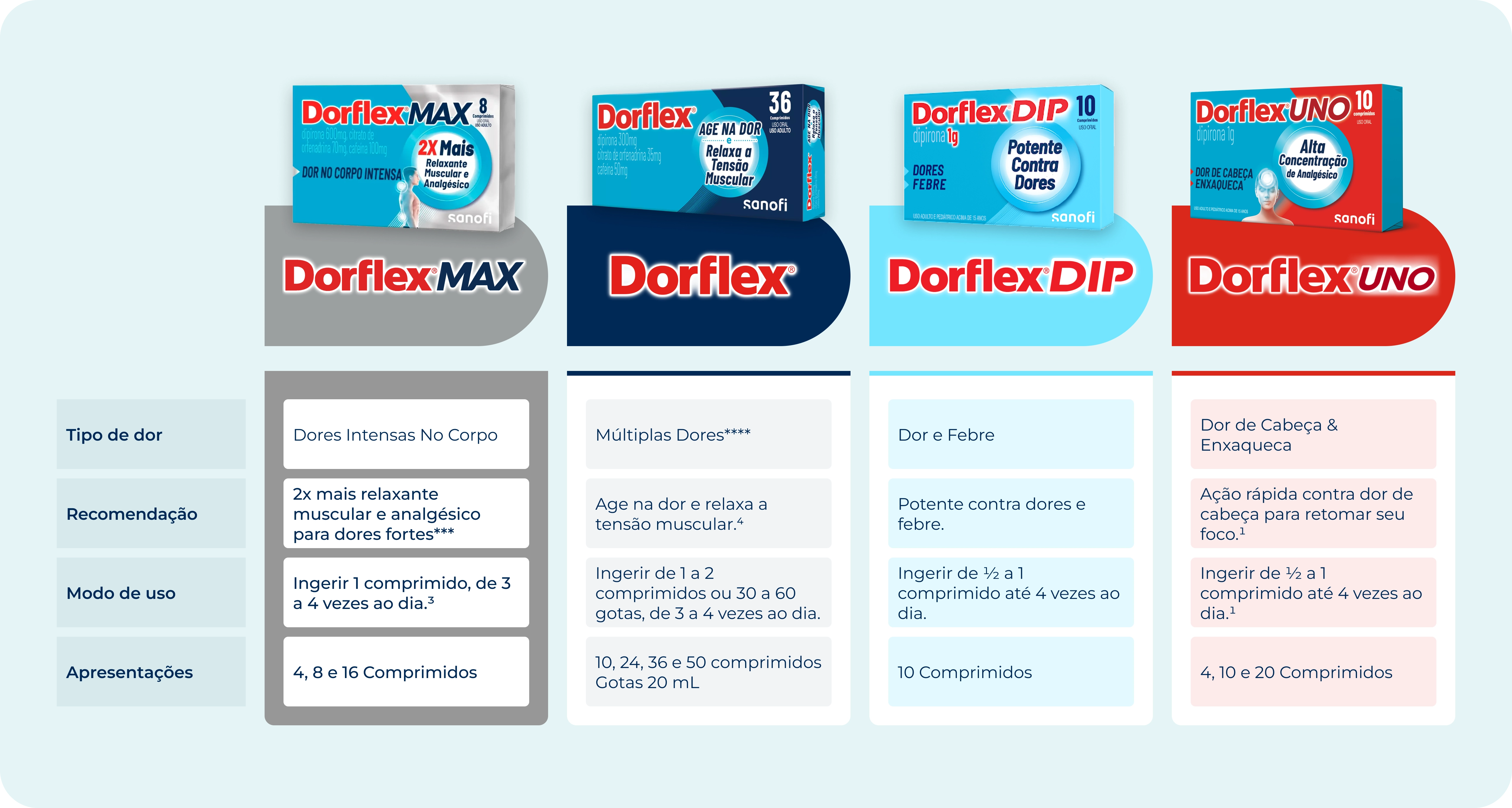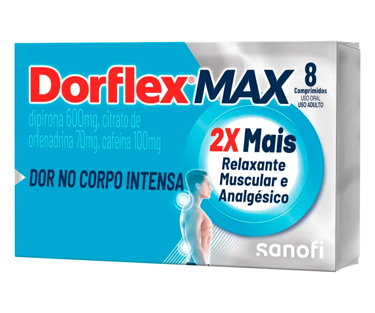 DORFLEX® MAX (dipirona monoidratada, citrato de orfenadrina, cafeína anidra). Indicações: no alívio da dor associada a contraturas musculares, incluindo cefaleia tensional. MS: 1.8620.0008. O USO DO MEDICAMENTO PODE TRAZER ALGUNS RISCOS. Leia atentamente a bula. SE PERSISTIREM OS SINTOMAS, O MÉDICO DEVERÁ SER CONSULTADO.