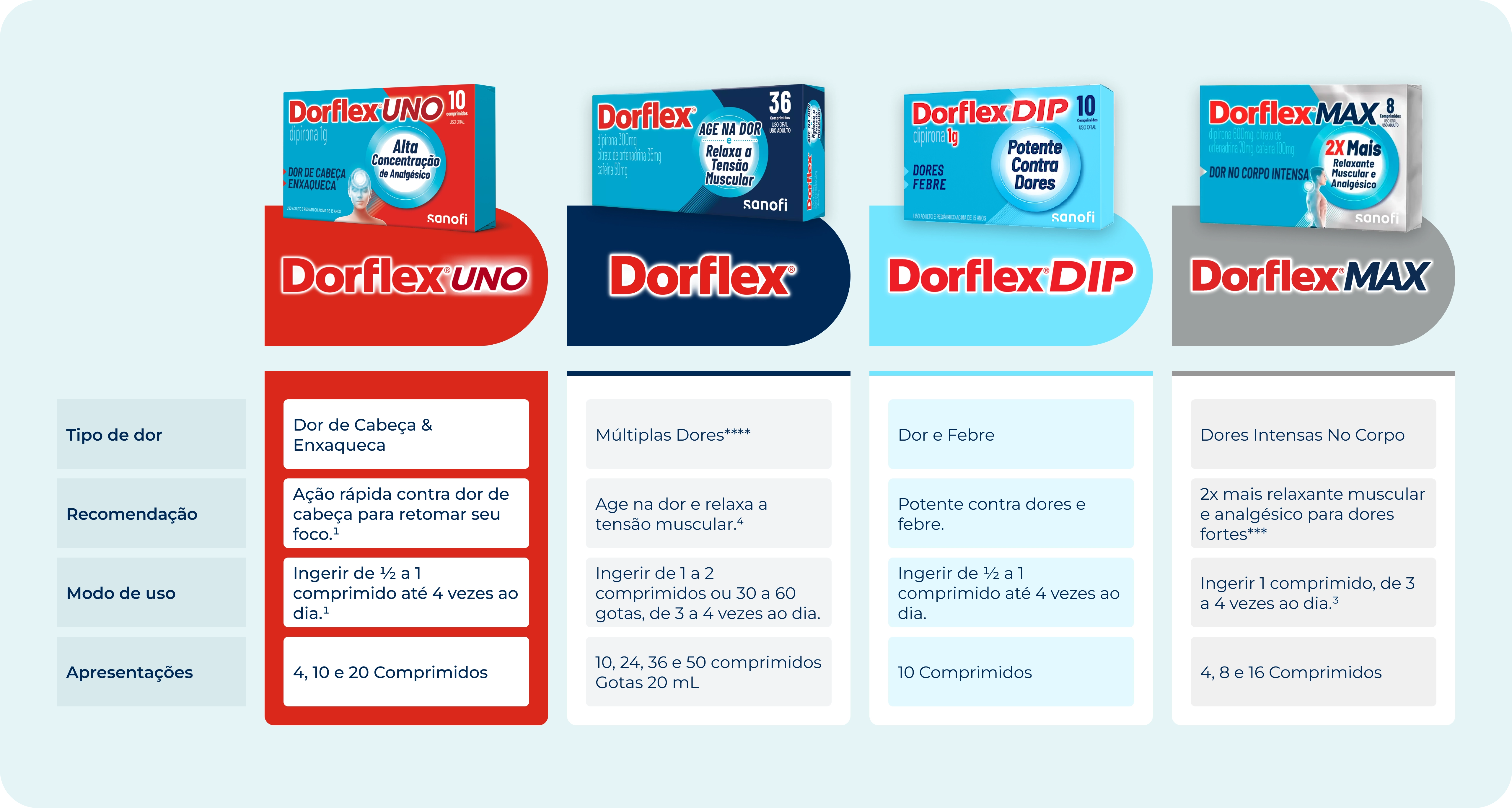 **** Dores associadas a contraturas musculares, incluindo dores de cabeça tensionalDORFLEX® (dipirona monoidratada, citrato de orfenadrina, cafeína anidra). Indicações: no alívio da dor associada a contraturas musculares, incluindo cefaleia tensional. MS: 1.8620.0008. O USO DO MEDICAMENTO PODE TRAZER ALGUNS RISCOS. Leia atentamente a bula. SE PERSISTIREM OS SINTOMAS, O MÉDICO DEVERÁ SER CONSULTADO.