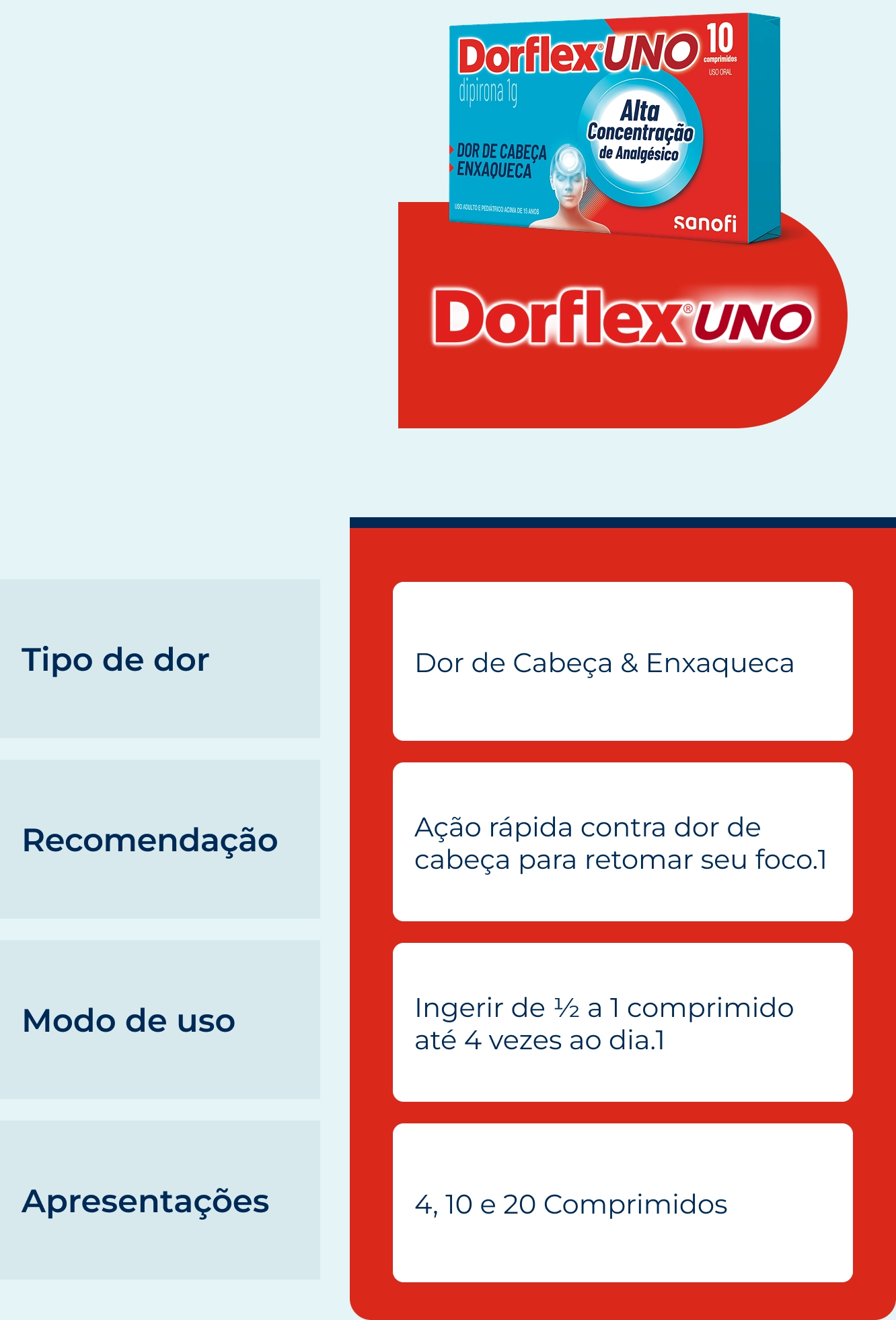 DORFLEX® UNO (dipirona monoidratada). Indicações: analgésico e antitérmico. MS: 1.8620.0009. O USO DO MEDICAMENTO PODE TRAZER ALGUNS RISCOS. Leia atentamente a bula. SE PERSISTIREM OS SINTOMAS, O MÉDICO DEVERÁ SER CONSULTADO.